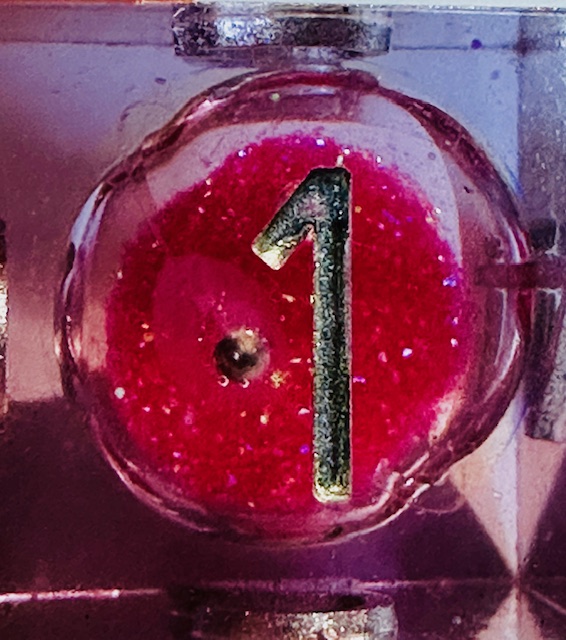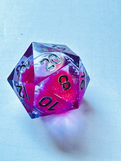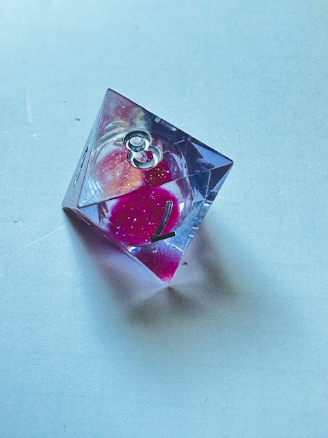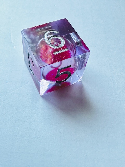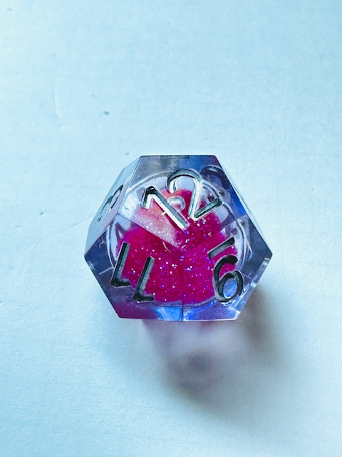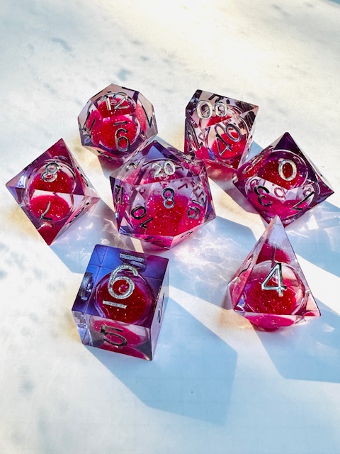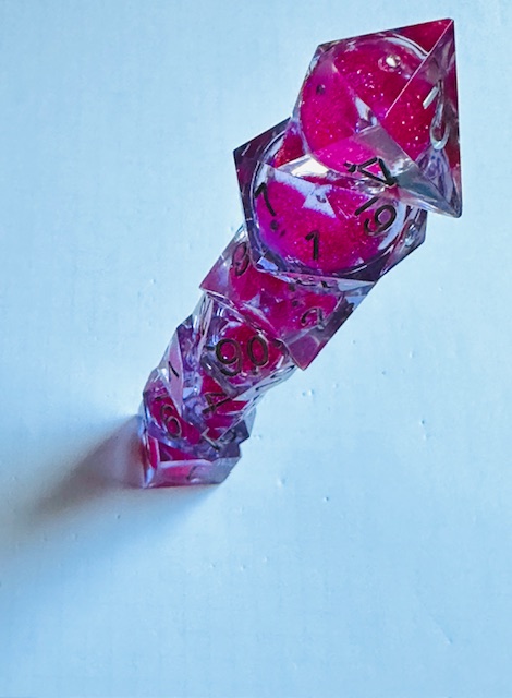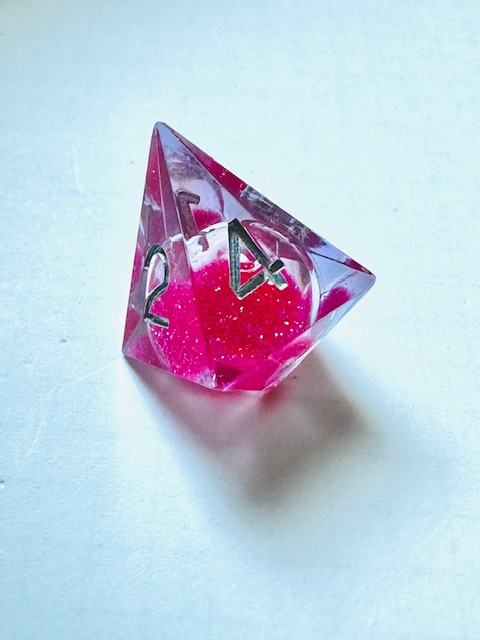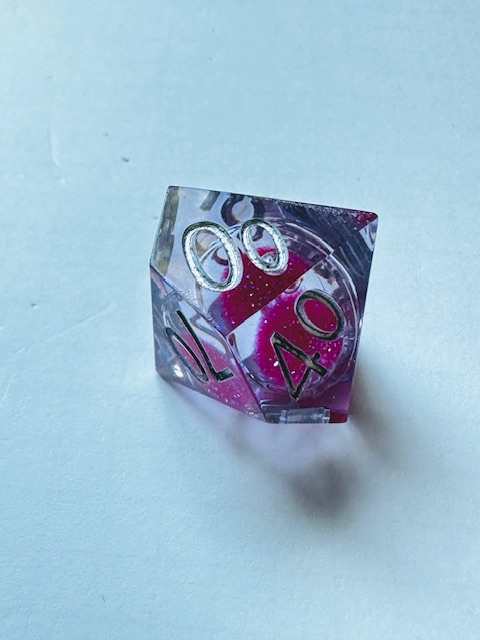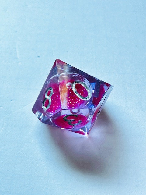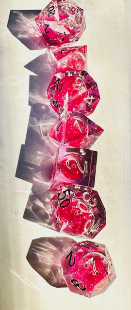 Description: A set of sharp edge resin dice in clear resin with liquid centers and pink glitter inside them. The dice use a fairly standard TNR-adjacent font inked in silver. The 6 and 9 faces have underbars to indicate orientation. The d10s have edged waists as almost all sharp-edge resin sets have. The d4 in this set is the “crystal” shape instead of the standard pyramid shape, and it’s slightly larger than other crystal-shaped d4s in other sets that I’ve reviewed. I strongly prefer the slightly bigger size for the d4.