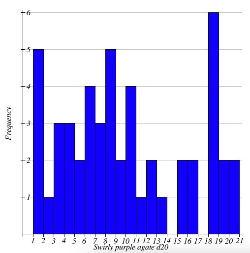 Swirly d20: 15, 12, 16, 6, 13, 1, 7, 6, 1, 8, 18, 18, 1, 4, 9, 10, 10, 18, 4, 16, 8, 20, 10, 9, 5, 18, 3, 19, 15, 4, 8, 1, 6, 20, 18, 10, 19, 7, 12, 1, 7, 3, 18, 3, 8, 11, 2, 6, 5, 8