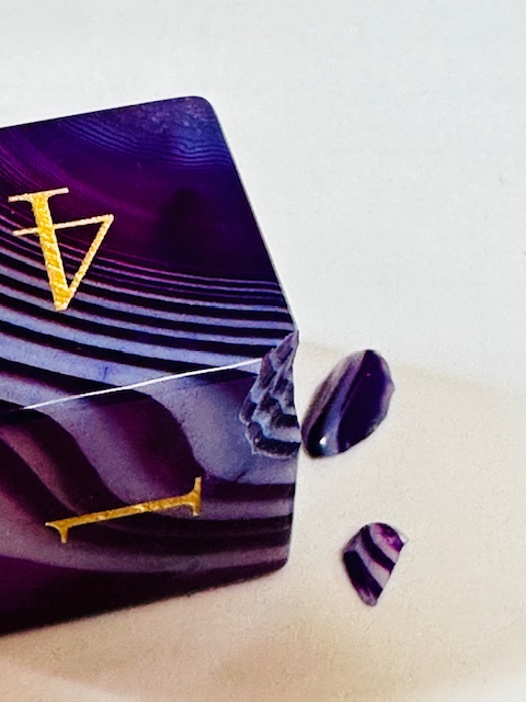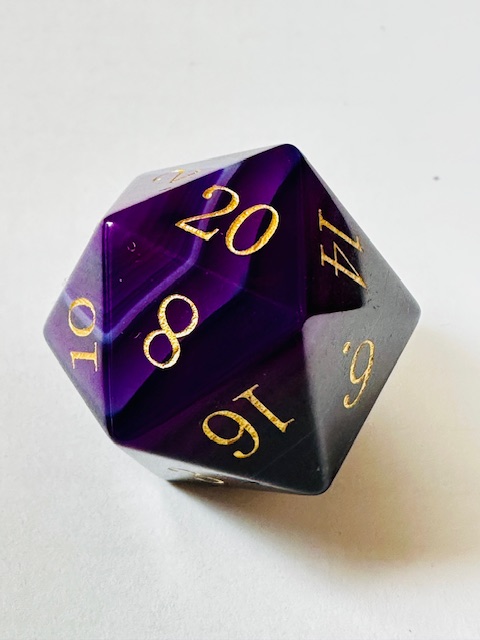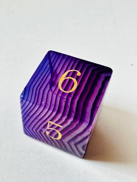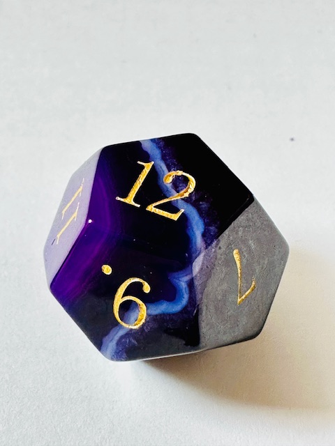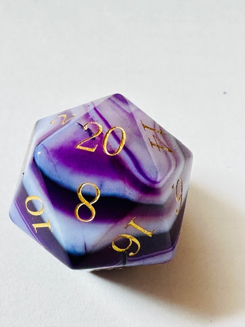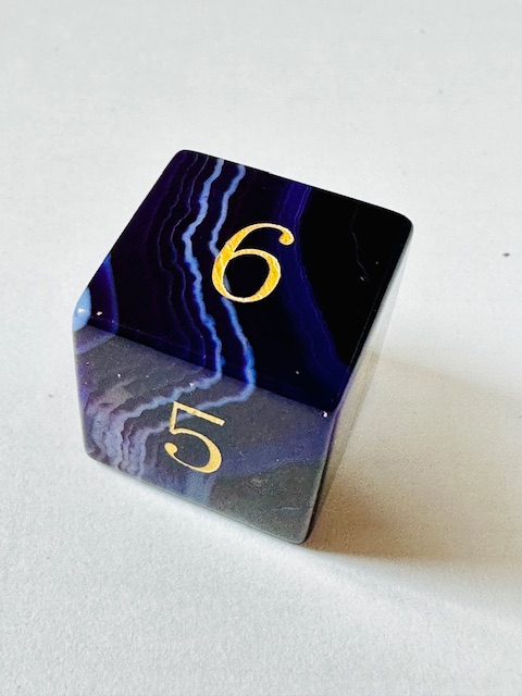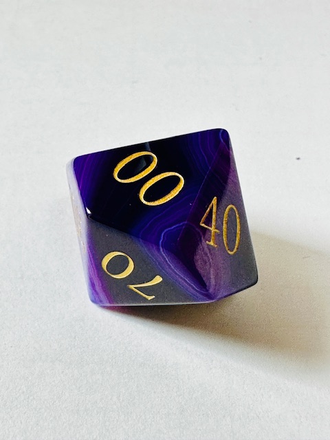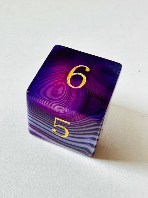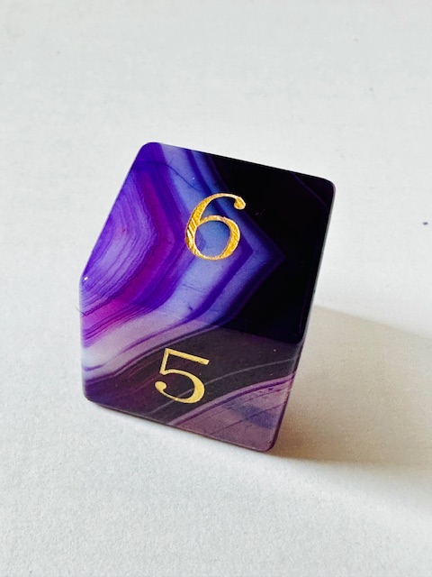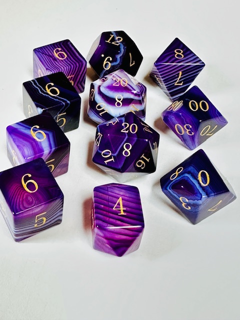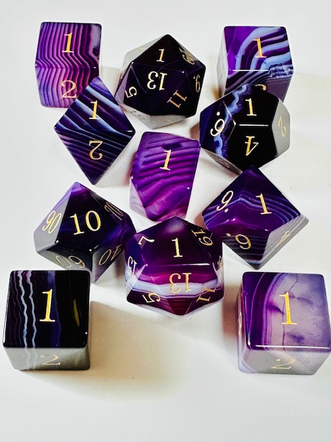 Description: This is a standard-size set of near-sharp stone dice. This is an extended set of dice which includes an extra 3d6 and an extra d20 in addition to the standard 7 dice. They are made in the standard shapes except for the d4 which is in the rectangular prism shape with the pyramid ends. The dice are a gorgeous deep purple color with very light purple stripes / striations / natural patterns in them The font is a very close to both Excelsior and Century Schoolbook. The font is inked in gold. There are once-again some serifs and some and little balls on the ends of the 2, 3, 5, 6, and 9s. The 6 and 9 faces use dots to indicate their orientation and the d10 and d% have edged waists. These stone dice are also available in a few other varieties / colors of Agate: (green, blue, black, red).