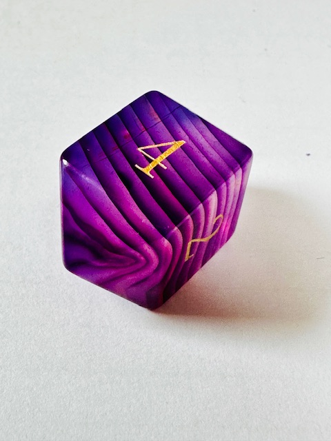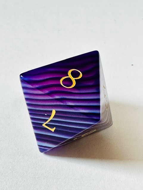 at 20.5mm, they are slightly larger than “standard” size, so that’s nice. The deep purple color is very lovely and the variation of the striping (striations) on almost all of the dice is awesome. The stripes are all light purple and almost white. Most of the dice have thin stripes. I love it that one of the d20s has very minimal striping and the other d20 has huge white stripes. There are only two dice that have minimal stripe patterns, the d12 and one of the d20s. The variation in the striping across the full set of dice is fantastic.