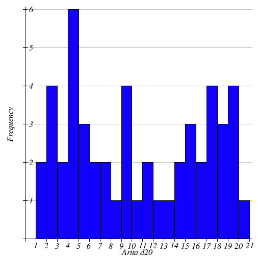 Arita d20: 15, 19, 19, 1, 18, 1, 2, 11, 7, 12, 4, 6, 2, 20, 4, 4, 3, 17, 16, 4, 10, 5, 5, 14, 3, 13, 17, 17, 6, 17, 18, 2, 9, 19, 18, 9, 16, 9, 11, 9, 5, 4, 7, 19, 2, 14, 4, 8, 15, 15