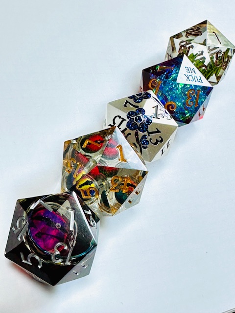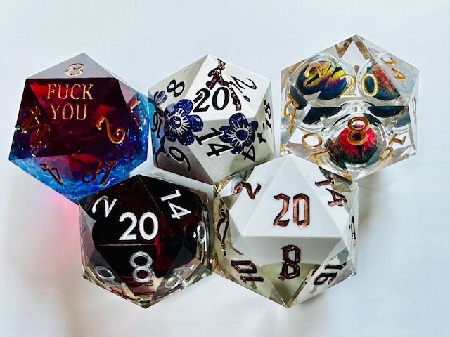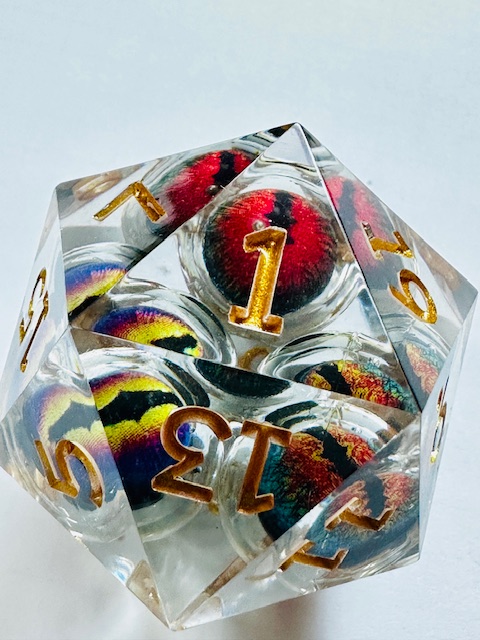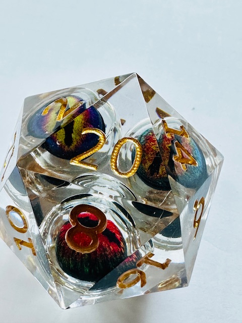 Beheld d20: This is a sharp-edge resin chonk d20. It is made with clear resin and has a liquid center which contains a few small eyeballs with very colorful irises & pupils. The eyeballs are in their own liquid capsules so they alway look upward no matter which face the die is resting on. The font is very simple, similar to PT Sans. The numbers are inked in gold