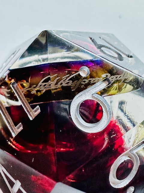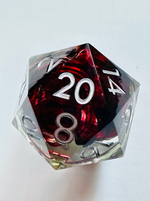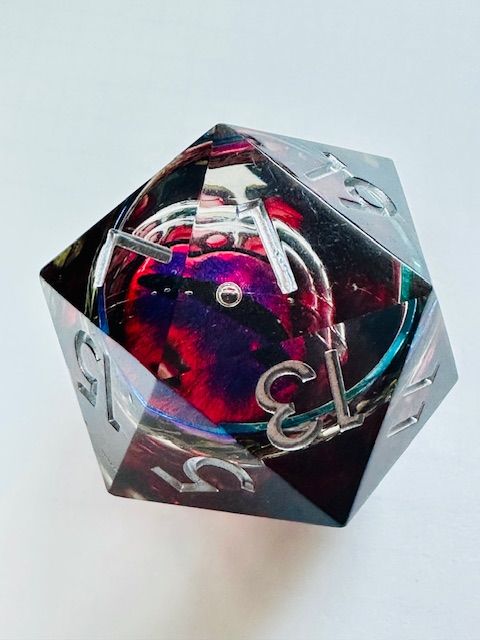 Dark Ring d20: This is also a sharp-edge chonk d20. It’s made with clear and deep red resin. It has a replica of the “one ring to rule them all” from the LoTR franchise with the Elven script around the outside. The ring is colored to look flame-torched / oil slick colors. There is also an eyeball in liquid in the center so that the colorful pupil faces up regardless of how the die is sitting. The font is very similar to Futura with a couple of very subtle differences. The numbers are inked in silver.