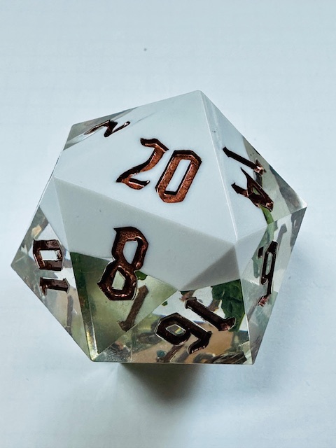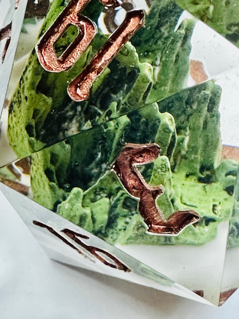 Kerwellsi d20: Clear resin with green foliage and bronze numbers