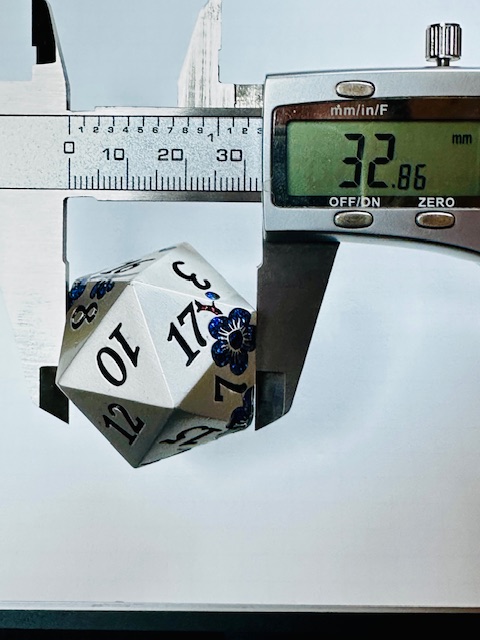 Arita d20: (Face->Face) 32.86 mm (Point->Point) 40.44 mm