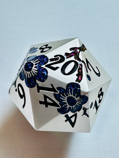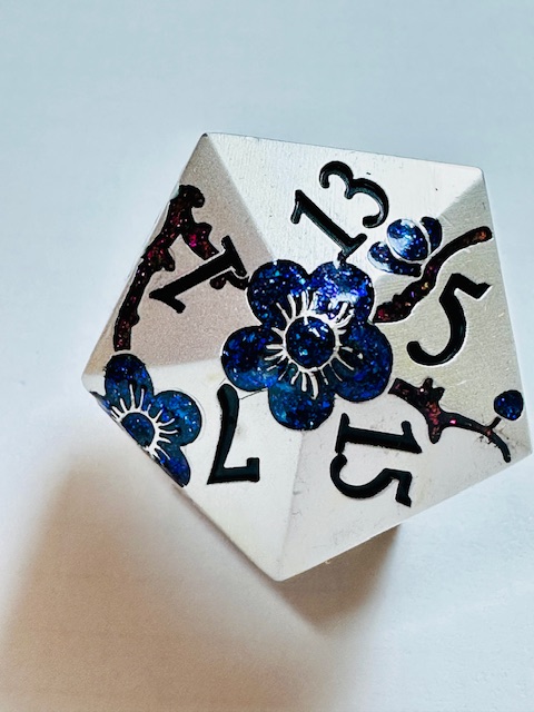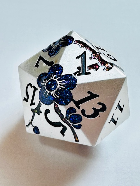 Arita d20: Silver metal with Sparkly red/blue flowers and branches, black numbers