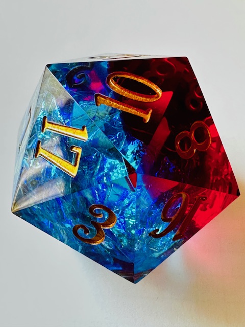F-words Red d20: Clear/red/black resin with a blue/green holofoil and gold numbers