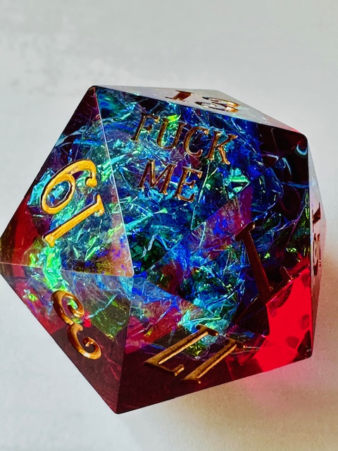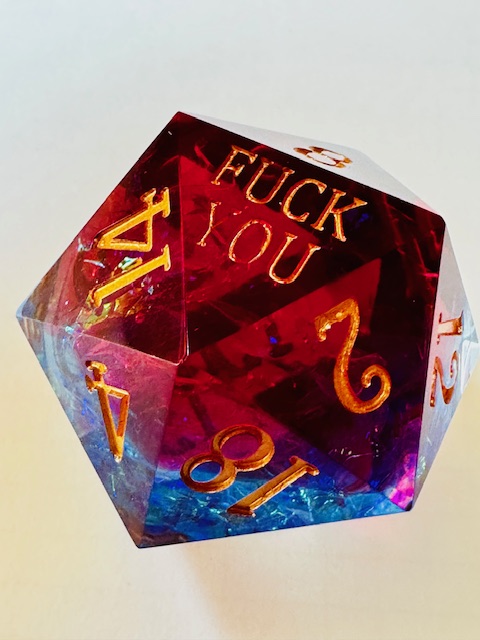F-words Red d20: I think the “Fuck you” / “Fuck me” for the 20 / 1 faces fits the personality of the player that this die is going to. I’ve interacted the most with their PC in-game and I think the die itself is gorgeous with the holofoil glow. I have a full set of non-chonk dice very similar to this one that I love (which I’ve somehow never reviewed here!) I hope that the words for the 20 and 1 faces will be appreciated by the player.