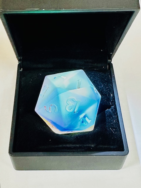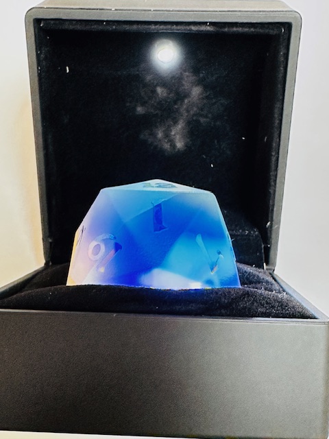 Final Thoughts: This is one of those dice that I’ve been after for some time. It’s on my “white whale” list at the bottom of my first post on this blog. It looked great online so I bought it and when I got it home and opened the little faux-leather box that it came in I audibly gasped a “wow!” The top of the box has a tiny white LED light that turns on when the lid is raised. The light illuminates the die and makes it look 10x better than any of these photos that I was able to take with my phone. It’s just an extremely beautiful die. I can’t wait to peacock it at my next in-person game session. It took a long time to find this and it wasn’t cheap but I’m extremely happy with it.