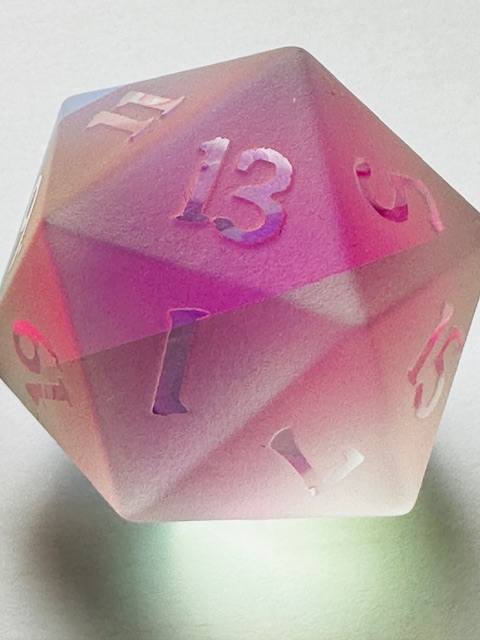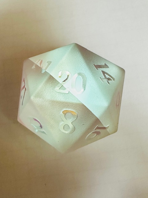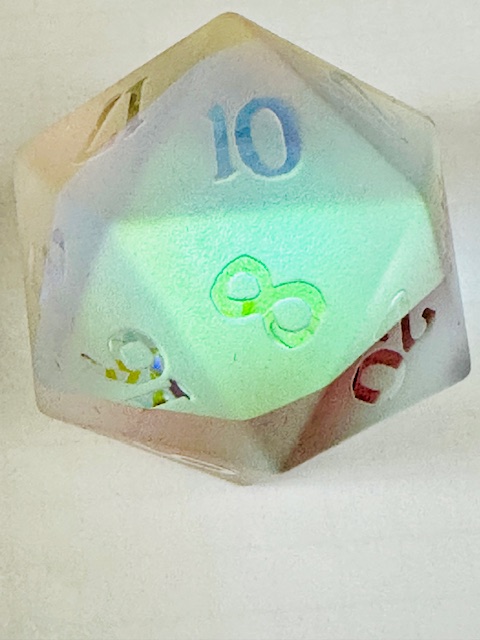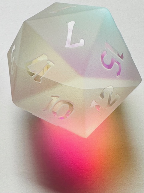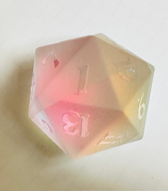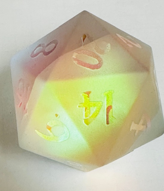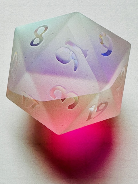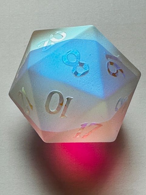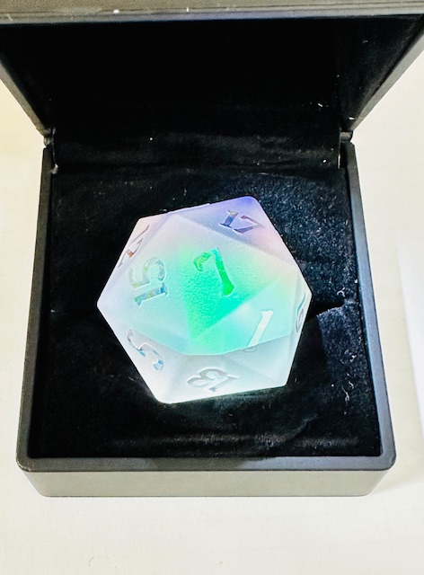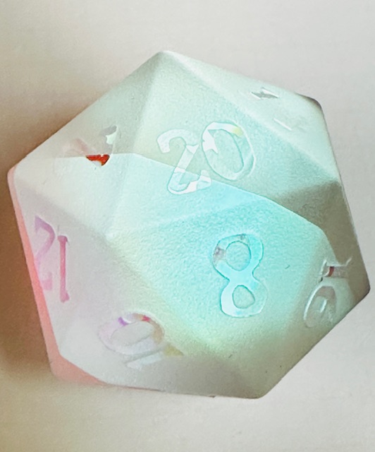 Description: This is a chonk d20 made of frosted dichroic glass. In normal light it is a soft near-transluscent white color. The glass is frosted, which gives it a gentle white color. The edges are not quite sharp and the frosted glass treatment makes the faces just the tiniest bit rough. The numbers on each face are slightly raised, smooth, and un-inked. The font looks plain and simple at first but then I noticed the slanted “wedge” serifs on the feet of the ones and the slightly domed flag on the top of the five. My font finder couldn’t do much for me. I can’t identify the font but it has elements of Basilia and ITC Clearface among others. The 6 and 9 faces use small dots to indicate their orientation. This chonk d20 came in a small plastic box similar to what you’d have for a wedding ring that you were about to propose with. The case has a tiny LED light in the lid that turns on when you open it.