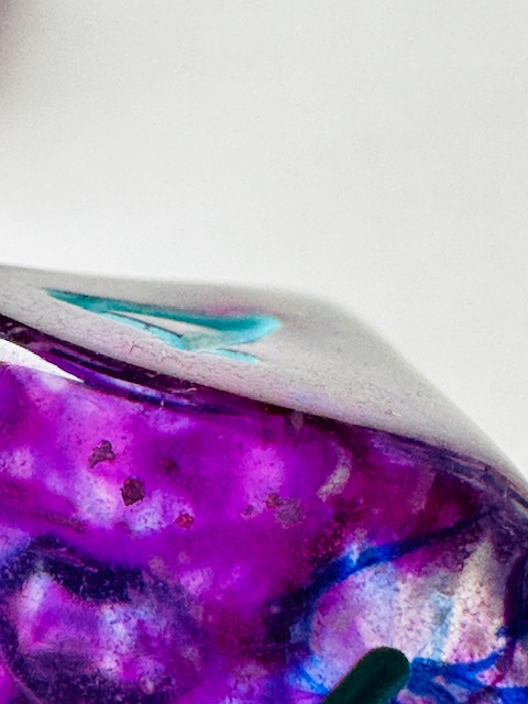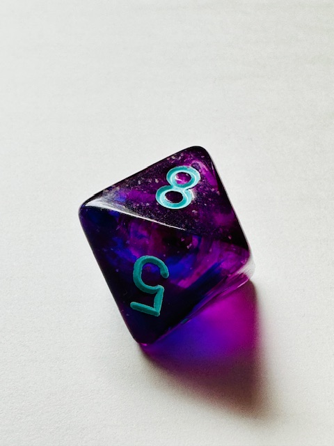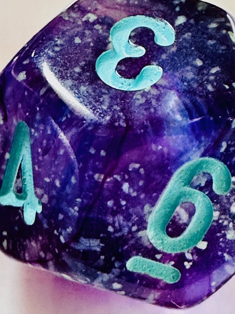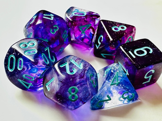 Description: This is a larger-than-standard size set of dull edge resin dice. They are made with clear and dark purple resin with swirls of dark purple resin and little fluorescent bits inside. The numbers are inked in a teal/turquoise color. The font is again very plain with straight sides on the 6, 9, and 0, nice curves on the 2, 3, 5, and 8 yet my font-finder couldn’t identify it. I’d say it’s got elements of CG Gothic No. 1, as well as Impact though it’s not wide and only a little bit bold. The 6 and 9 faces have underbars to indicate their orientation. The d10 and d% have dull edged waists. These dice came in a plastic box as many Chessex dice sets do. These are a larger version of standard Chessex dice.