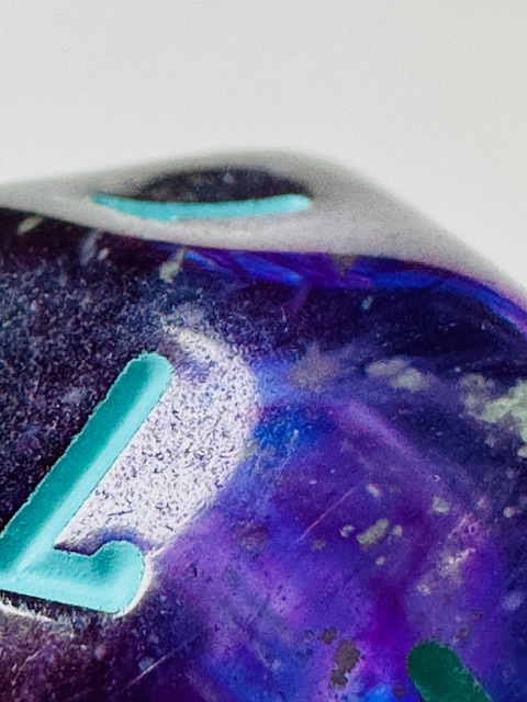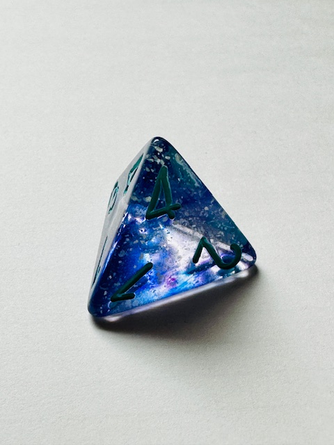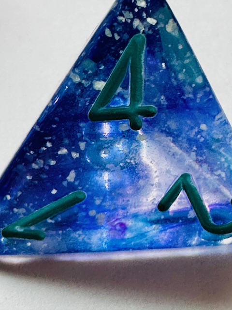 The downsides of this set are that they wander around the table/tray when you roll them which I’ve been vocally opposed to in the past. Also, many of the faces of the dice have slight depressions from the material they used and the effort spent making them. I’m guessing that the faces slump in a bit in the molds when they’re curing. I think this is common in lower-price-tier dice. The inking and carved numbers are unfortunately sloppy when you look closely at these dice and that the color of each die is a bit inconsistent. The d4 compared to the d6/d8/d10 for example.