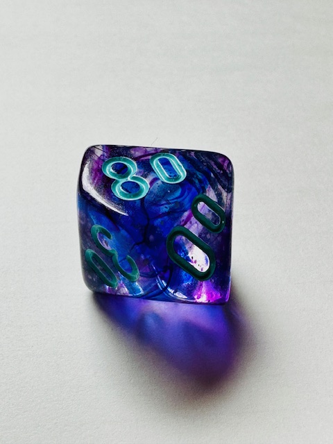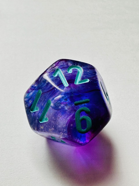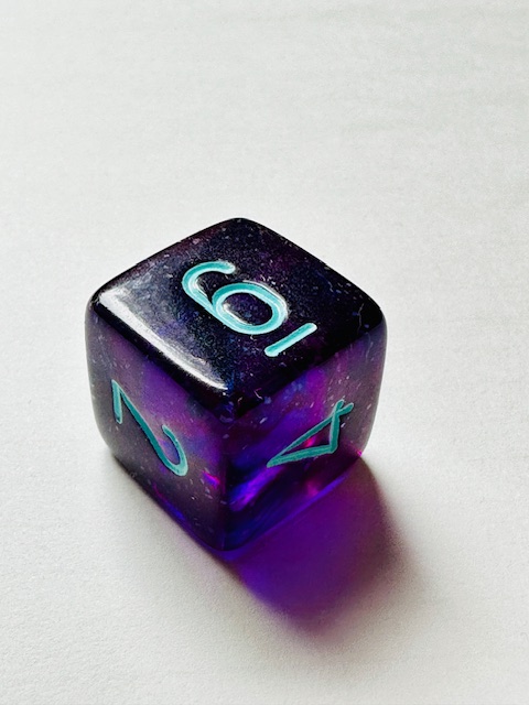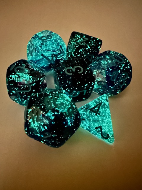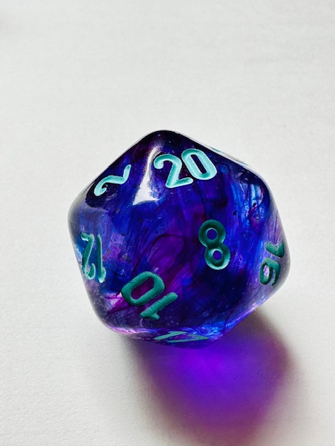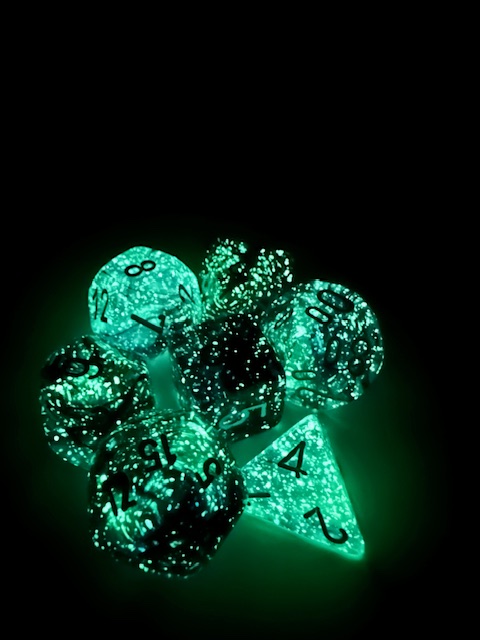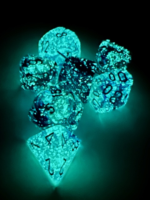 Final Thoughts: I saw these dice at a local book store in their tiny D&D section which had several different sets of dice to my surprise and delight. I bought this set because I liked the purple / light blue combination and because they’re larger than standard dice by a good bit. Also I just wanted to buy more dice. I guess those are pretty much all of the upsides to this set of dice. Oh! Also, they glow in the dark. I don’t ever play D&D in the dark though so I won’t be using this feature of the dice other than for the photos above.