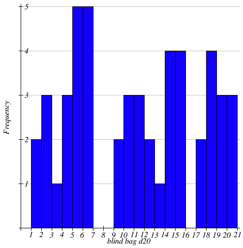 Fifty d20 rolls (d20 from the blind bag Set): 14, 17, 15, 14, 20, 14, 11, 2, 15, 6, 14, 10, 9, 20, 19, 5, 19, 18, 6, 5, 12, 18, 2, 9, 1, 18, 10, 5, 11, 20, 19, 11, 10, 6, 15, 15, 4, 6, 4, 1, 17, 12, 5, 2, 18, 6, 13, 4, 3, 5