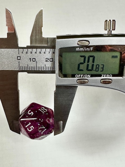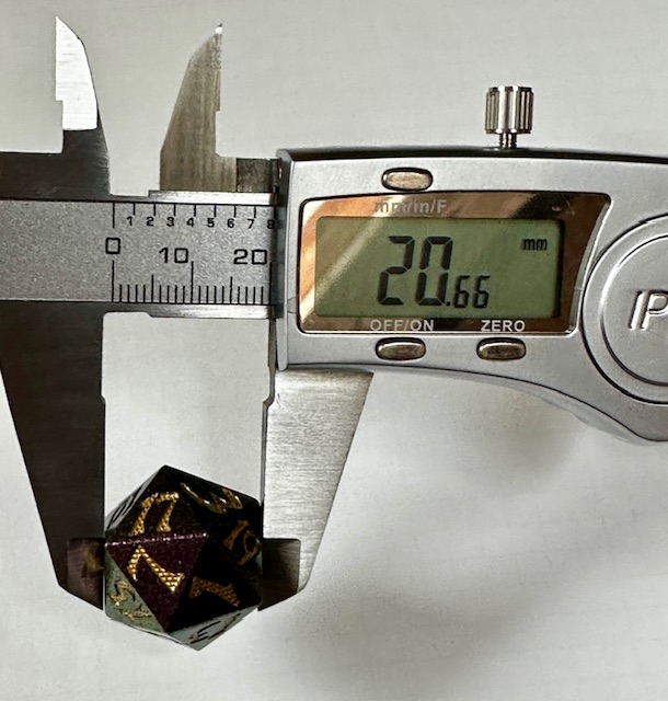 Metal d20: (Face->Face) 20.66 mm (Point->Point) 25.39 mm