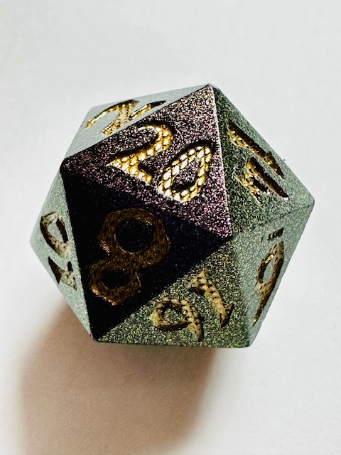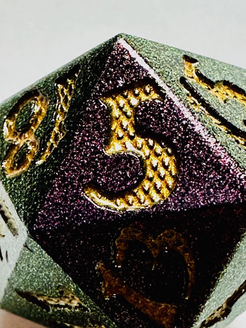 The color consistency on the set of 7 dice is not very good. Some are very dark, and a few are quite light in pigment. I think it’s more “don’t care” than on purpose making a gradient set or something. The color scheme of the extra d20 is fantastic. I love the gold on shimmery dark purple.