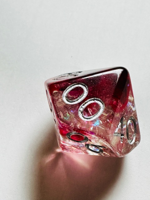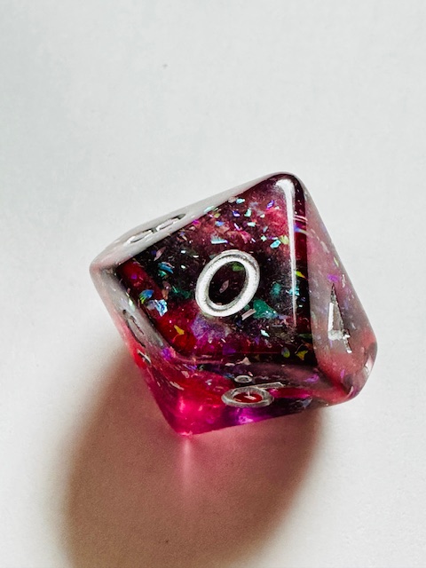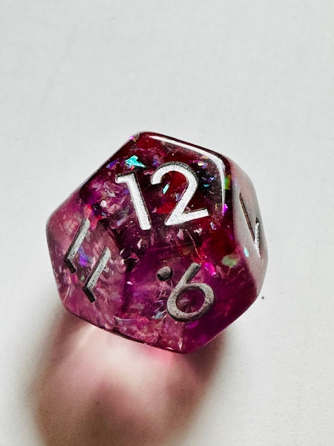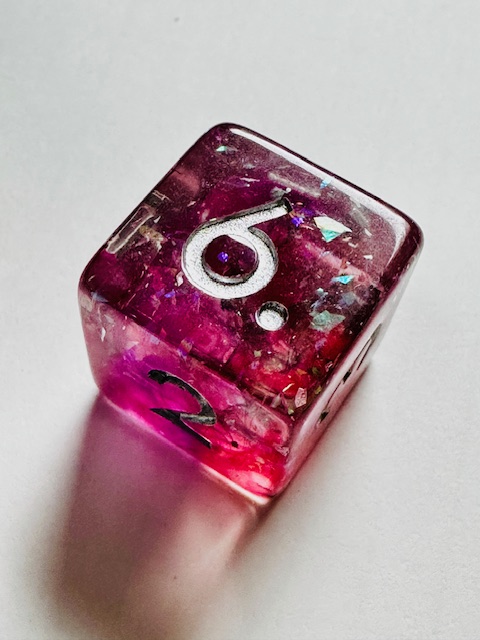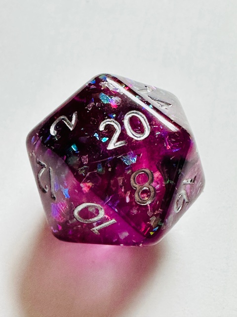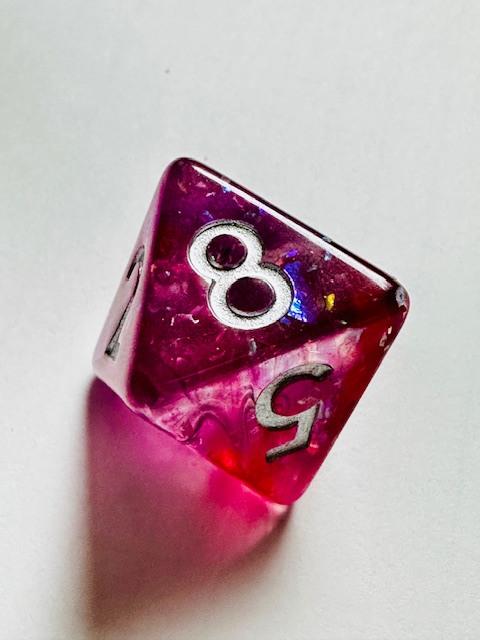 Description: This is an average size dull-edge set of 7 acrylic dice plus a bonus metal d20. The acrylic set are made of clear and redish pink resin with bits of holofoil inside. The numbers are in a very basic font (Arial?) and inked in silver. This set uses small dots to indicate the orientation of the 6 and 9 faces. The bonus metal d20 is slightly larger than the d20 from the acrylic set. It has deep purple faces which sparkle when the light hits them. The font used is kind f a spooky font with wide characters. The numbers are inked in gold and the carved out numbers in the dice have a texture to them. This d20 uses underbars to indicate the orientation on the 6 and 9 faces. These dice all came together in a “blind bag”.