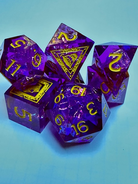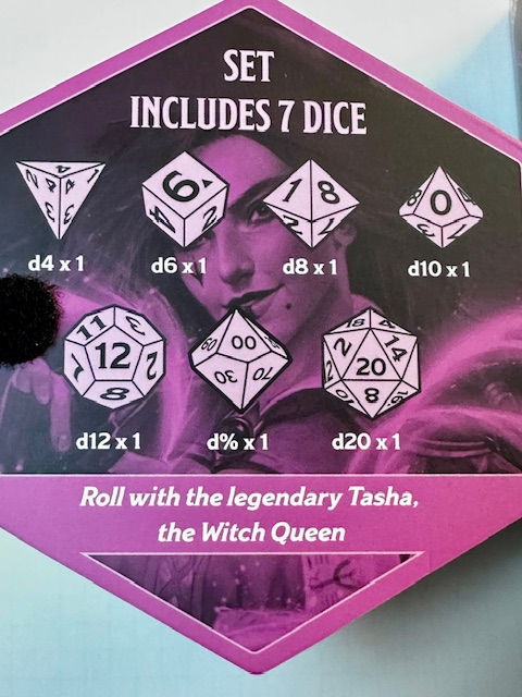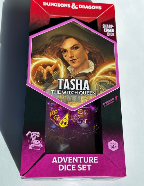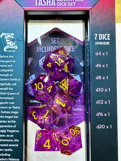 Update: Tasha is the only set of NPC themed dice so far. Come on WoTC. Any of those 4 I mentioned in the paragraph above would be great to use for a themed set of sharp edge resin dice. They’d sell like hotcakes!