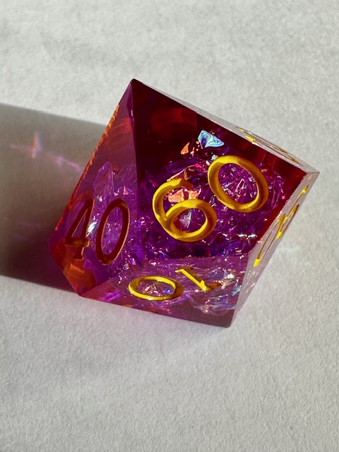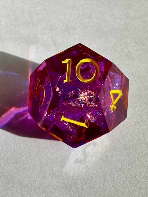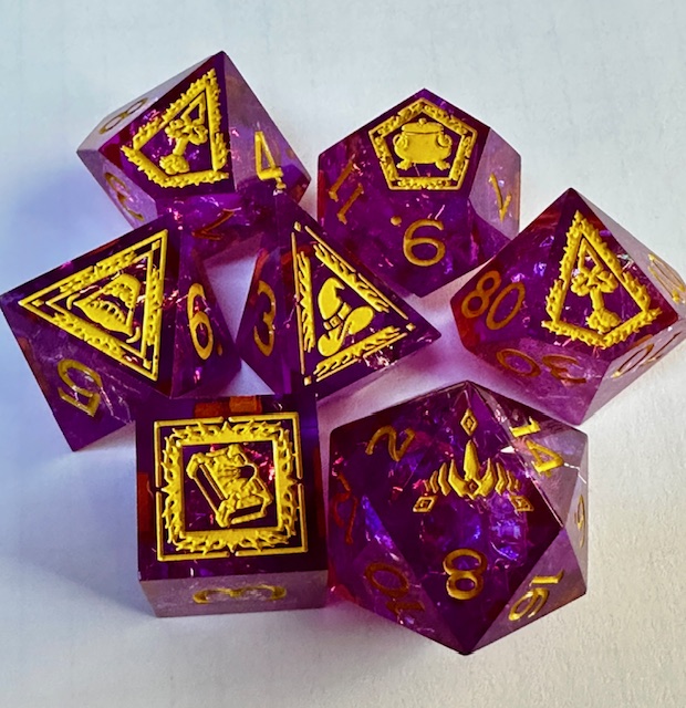 What I don’t like but don’t hate about them: The logos on the high face of each die…. They don’t mean much to me. I get the cauldron (she’s a witch), the stereotypical witches hat, and the book (spell book) but the rest I haven’t figured out yet. I’m glad that it’s not just the 20 face on the d20 that has the picture on it. Next: they used the prism d4 shape which I’m surprised to see. I didn’t think that WoTC knew that alternate dice shapes existed. I can’t imagine I’ll ever see a rhombic d12 from them though. The d12 is a bit undersized for the set. It would ideally be slightly bigger than the d6 and nearly as large as the d20. The tip of the d4 is very slightly chipped. I only noticed it because I took close-up photos of all of the dice and zoomed in on the photo. The dice roll very low for me so far. Finally, they’re a bit plonky rolling. They don’t roll smoothly, they kind of skip on the vertices or stop and slide on a side depending on how they land. Heavier dice have the inertia to roll end over end and lighter dice seem to spin faster. These are mostly small complaints though, I still like the dice plenty enough to use them / keep them.