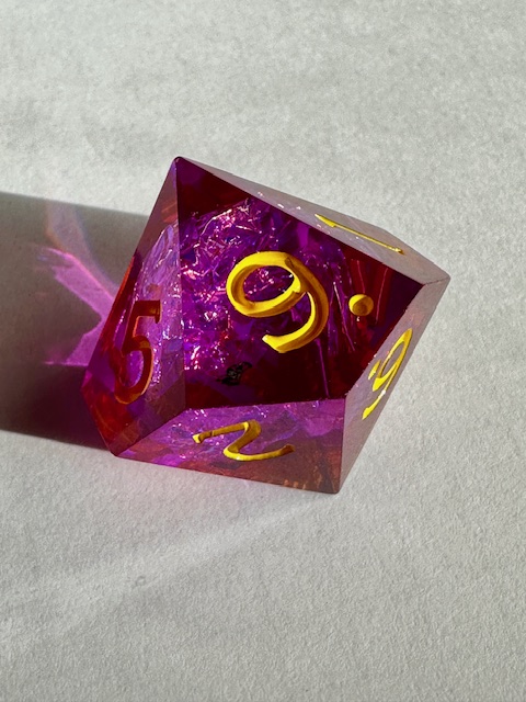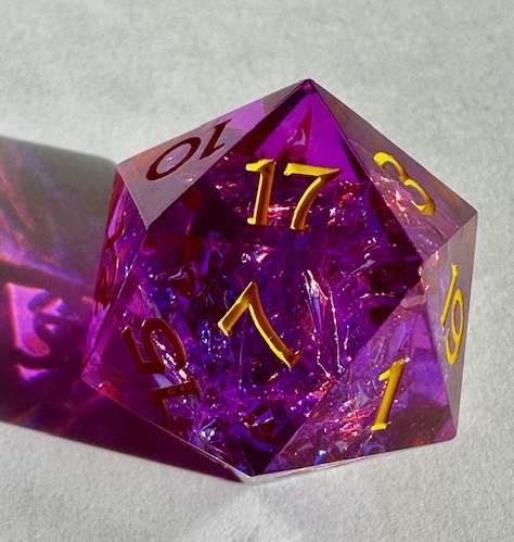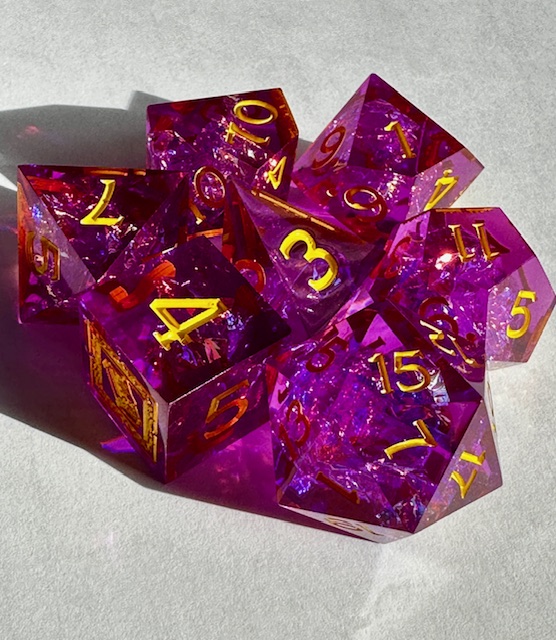 What I like about them: They’re very sharp and they’re a great size, noticeably bigger than the standard 18-19mm dice that WoTC sells. The purpleish/magenta color of the dice is lovely and when paired with the gold/yellow numbers and the gold holofoil inclusions, they’re very pretty. The packaging was very well done, lots of information and great artwork.