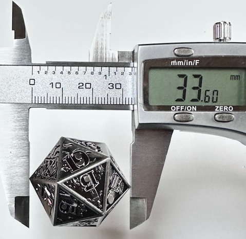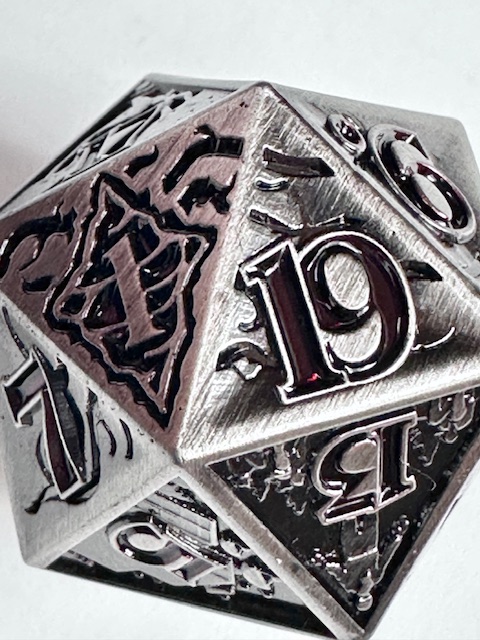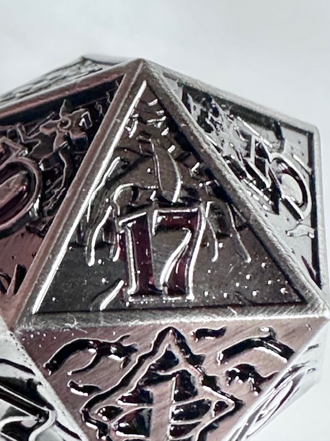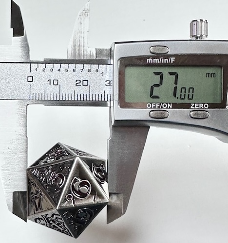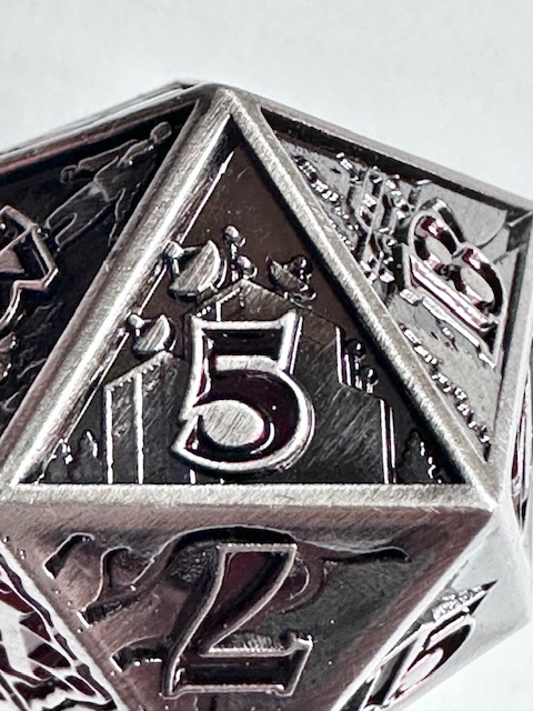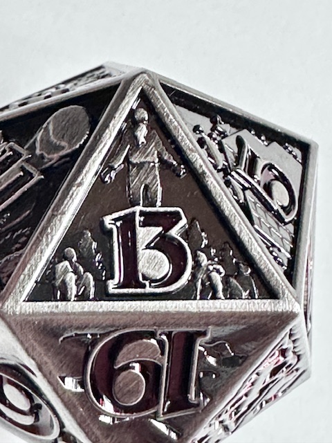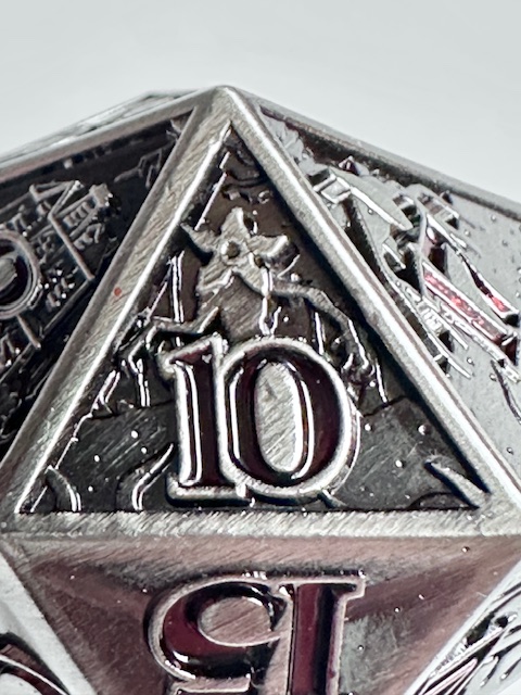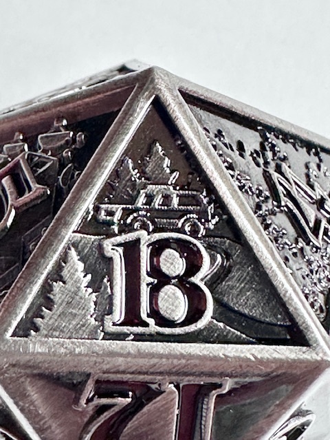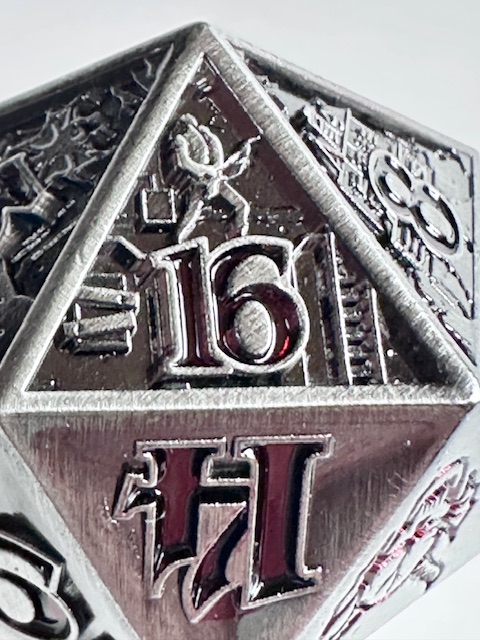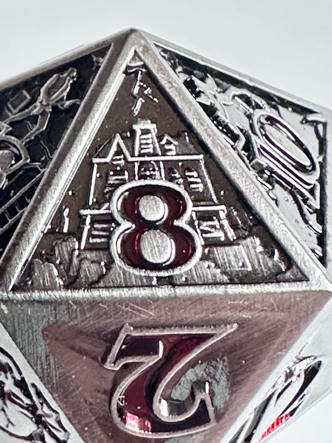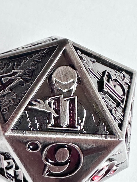The die is very heavy and well made. The 10 faces that have the scenes carved into them are well done (better than I expected) but they are a little bit hard to see because of the level of detail that they contain. They even put the main character of the show, who they call “El” which is short for Eleven, (the number tattooed on her by the evil doctors that experimented on her as a child… it’s a whole thing) on the 11 face of the die. The numbers are inked in a dark blood red color which looks neat but make them harder to see in dim light. I have to reiterate that the designers used the actual font from the show instead of saving money by taking a few existing fonts and mashing them together to avoid extra licensing fees. I’m really impressed with that. The die with the scenes on the faces, proper font, and red numbers makes for a very neat design based on a very good show. I’m also impressed that the die is actually the size that they say it is. 27mm on the dot, something that never happens. I’m guessing that these dice are all pretty close to that measurement and I got lucky and bought one that just happens to be exactly the right size instead of a few micrometers larger or smaller. The size is good for a metal chonk. As they get bigger than this, the weight starts to go past the tipping point and large metal chonks become a little unwieldy. I like sharp edge resin chonks a little bit bigger than this but 27mm is a fine size for a metal chonk.