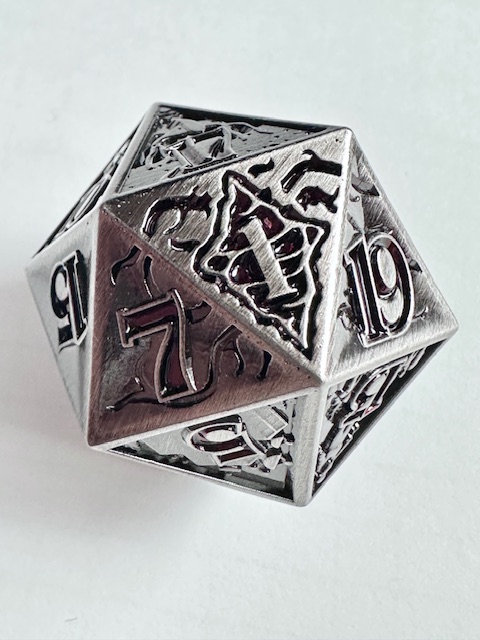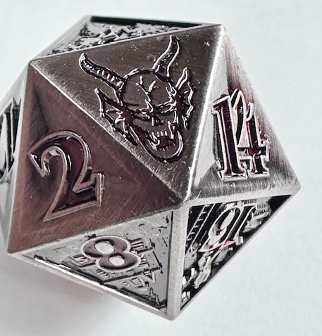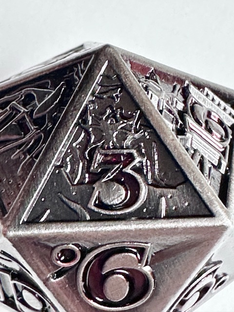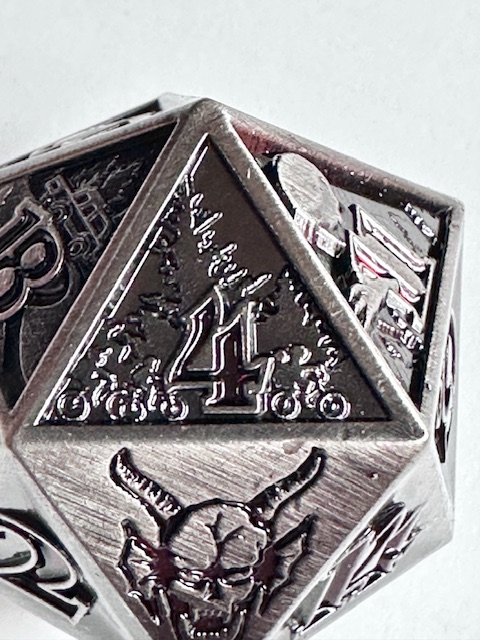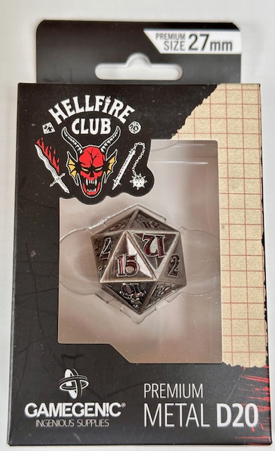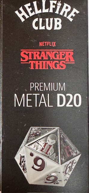Description: This is a single metal d20. It’s larger than standard, just barely into the “chonk” size range. The metal is a dull gray color with triangular concave faces and carved numbers painted a deep blood red color. Ten of the faces depict two paneled scenes from “The Upsidedown” in the show Stranger Things. The 20 and 1 faces also have designs on them. The demon from the Hellfire Club is carved on the 20 face. The font is an outlined version of ITC Benguiat Bold. That’s the font. Period. I can’t believe that they used an actual font that they use for the show. Thank you GAMEGEN!C. (That’s how they spell their name, with an exclamation point for the ‘I’ in “GENIC”). The 6 and 9 faces use dots to indicate their orientation. The die was released to coincide with the release date of the 5th season of Stranger Things on Netflix, which I’m currently watching.