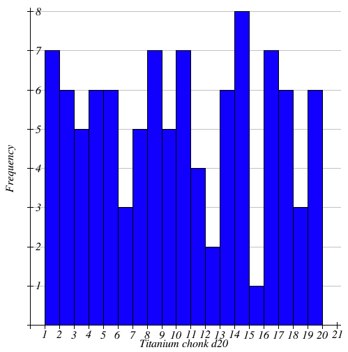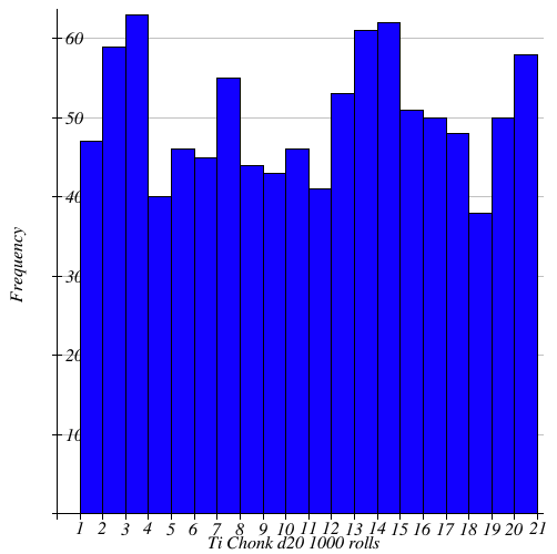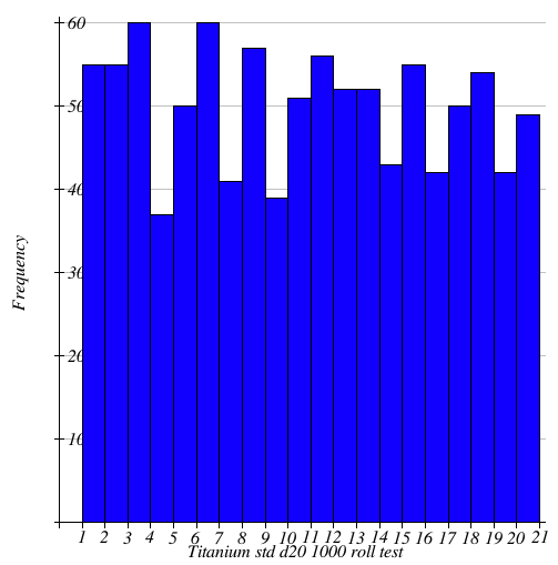 Ideally each number would be nearly the same in it’s frequency with the mean (average) roll being around 10.5. At 10.322, the standard size d20 is very close. The Chonk d20 is spot-on with 10.521 though.