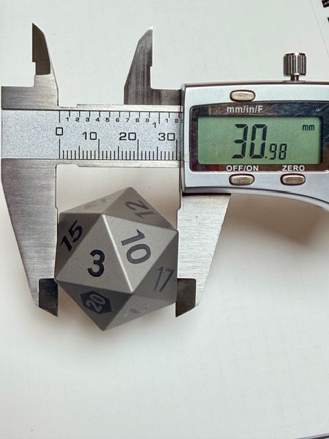 Standard d20: (Face->Face) 30.98 mm (Point->Point) 38.17 mm