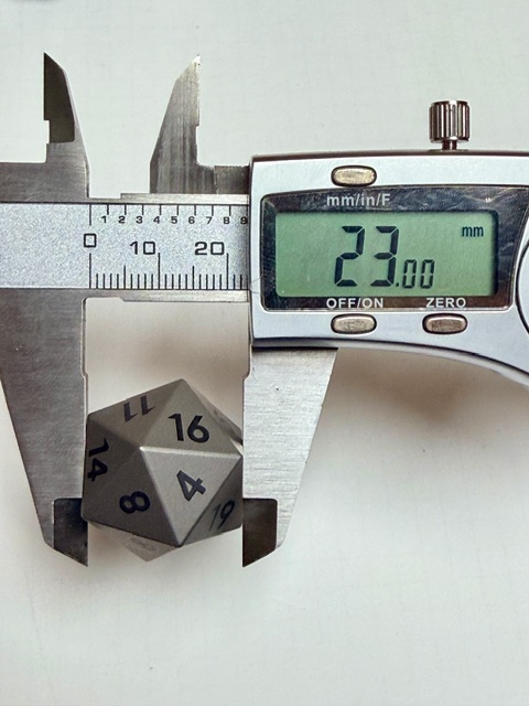 Standard d20: (Face->Face) 23.00 mm (Point->Point) 28.37 mm