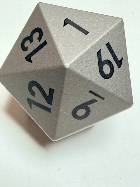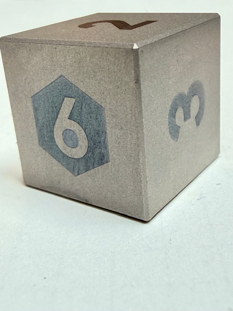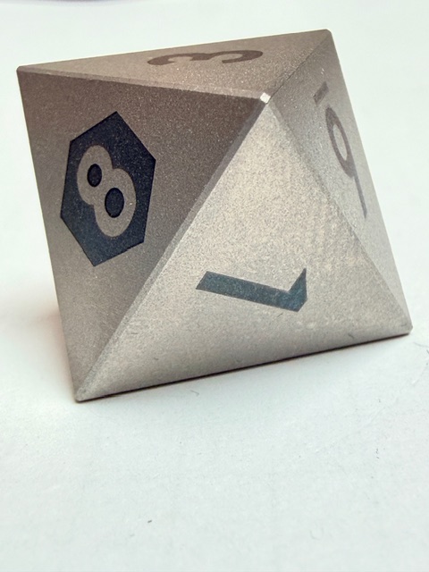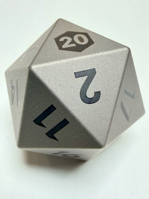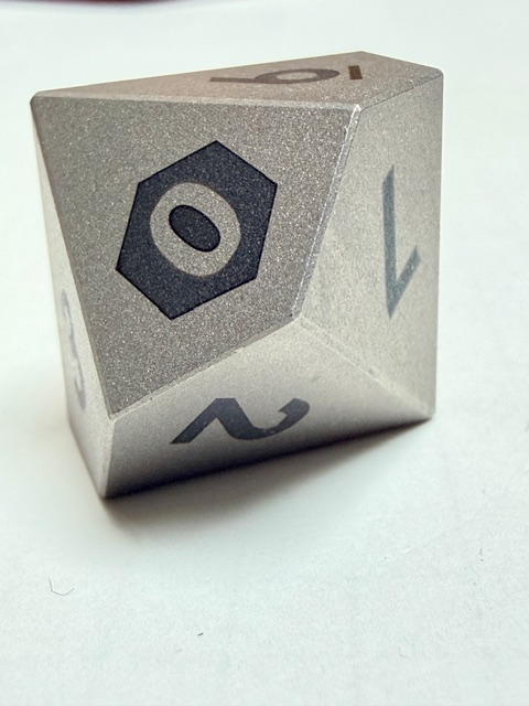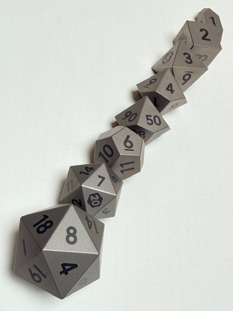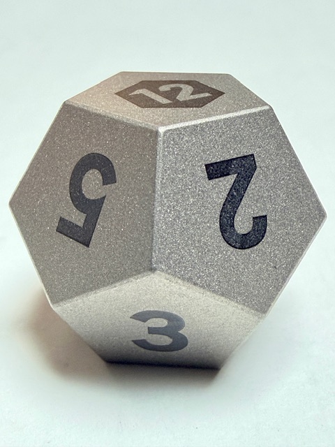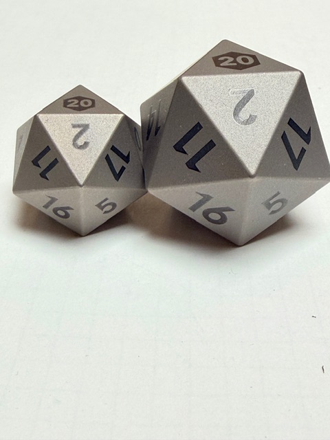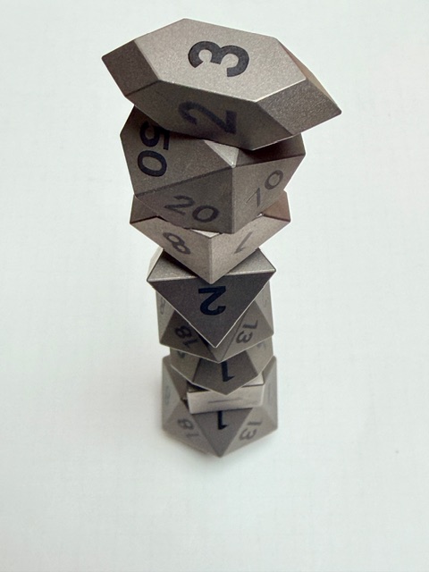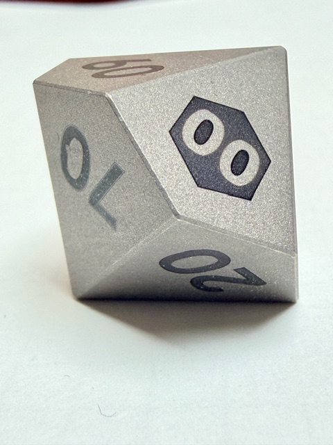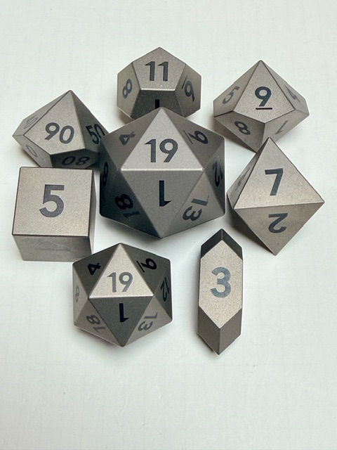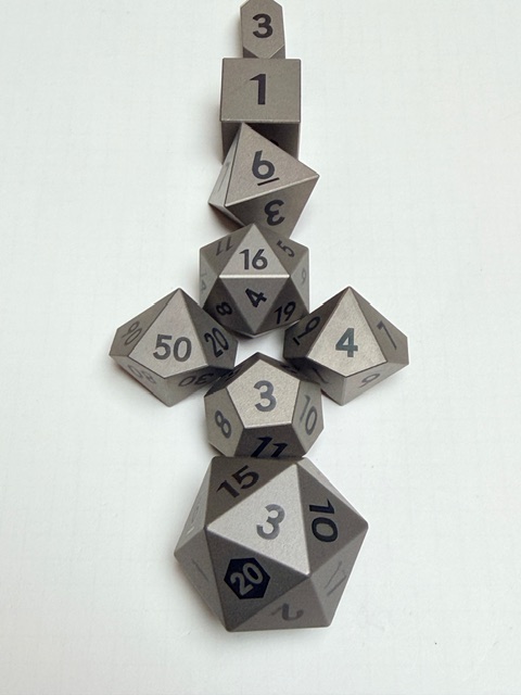 Aesthetically these dice are rare beauties in form though maybe not in color. There’s nothing wrong with the muted colors, or rather the absence of color however. The size of this set of dice is perfect for my preferences. Big enough that they feel heavy and substantial in your hand, easy to pick up, and easier to read with the larger faces. These dice are made from Ti-6Al-4V Titanium which is more than 50% denser than Aluminum. This type of Titanium boasts a range of 300 – 390 on the Brinell hardness scale. The 7075 Aluminum dice that are featured in the previous review come in at 130 – 150 on that hardness scale. Stainless Steel is generally in the 130 – 290 range on the Brinell scale. This set of dice is made from space-grade Titanium which means that they’d be very difficult for me to damage… even with a sledgehammer.