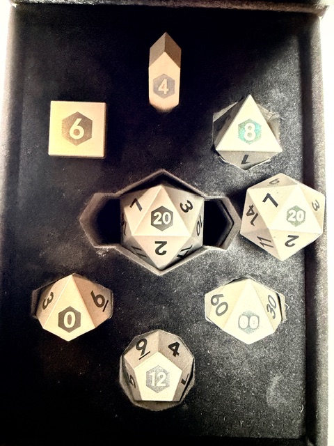 Titanium dice. Precision made from Flying Horseduck. Expensive and gorgeous just as you’d expect.