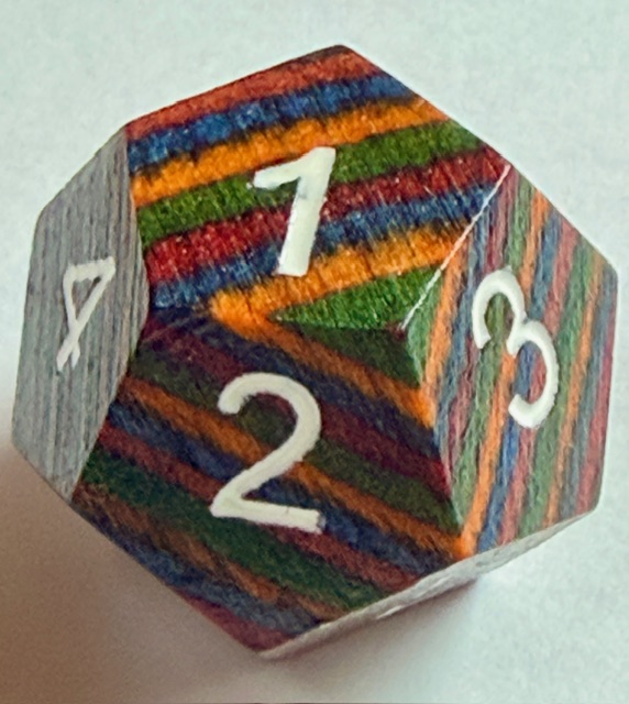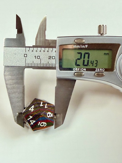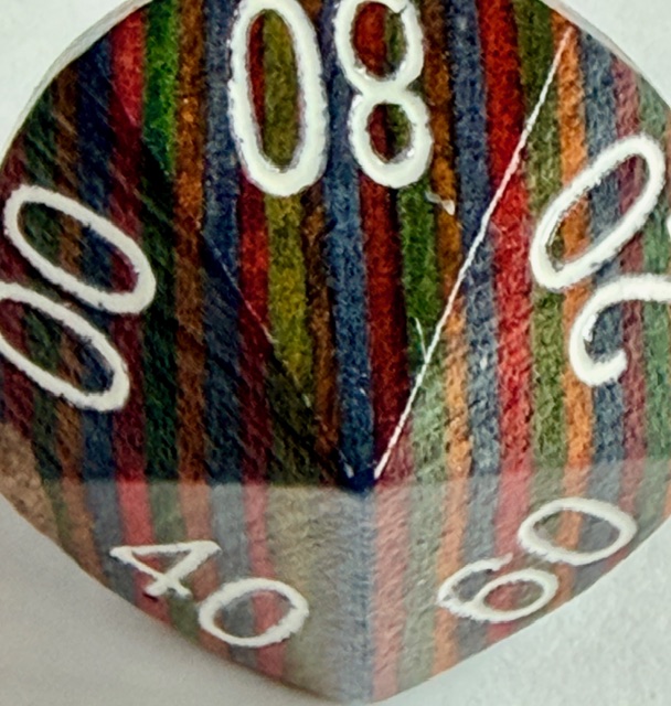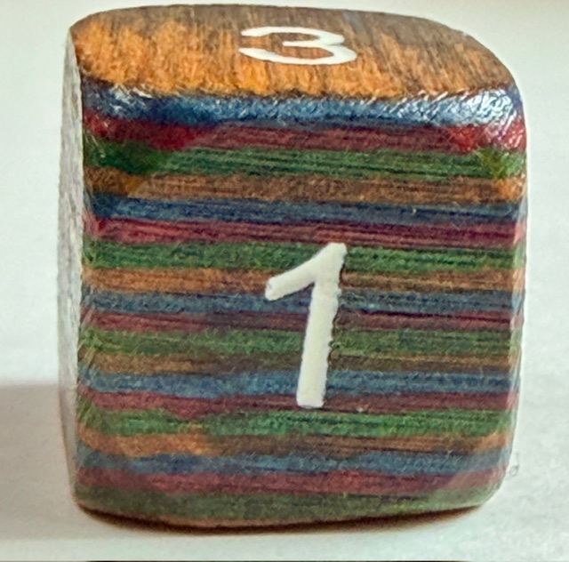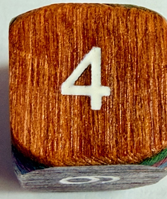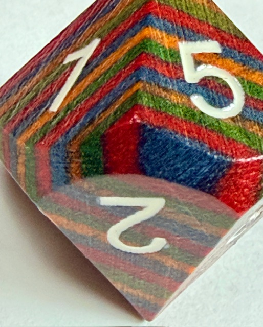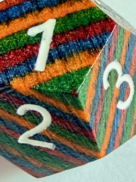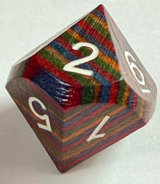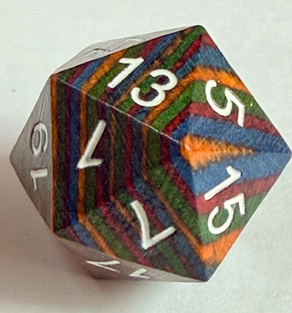 Final Thoughts: I’ve been half-heartedly looking for a wood set of dice for a while now. I’ve seen other sets that are made from relatively plain wood that look bland. The bland wood and knowing how light they’re going to be usually dissuades me from buying them. I like the color of this set with the different pressed woods. It reminds me of the wood that they used to (maybe still do?) make skateboard decks out of that I used to ride every day. The boards weren’t this colorful and usually had a lighter color wood for most of the layers but there’s still a touch of nostalgia when I see these dice. I have a chonk d20 that’s made from a very similar wood composition (see post #060 “Would I Lie To You?”). I like the color and feel of that d20, mostly because it’s a chonk and chonk d20s are the 2nd best dice ever. (The best shape is the Rhombic d12). The chonk d20s in that review are my “cheater” dice because I suspect that they are off-balance and lean toward rolling 20s. I can’t prove it but I had some odd rolls white writing that review and also while using them since then.