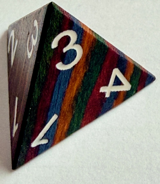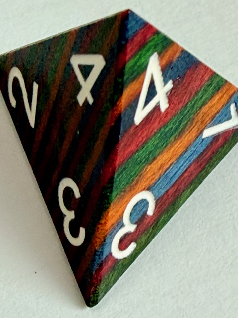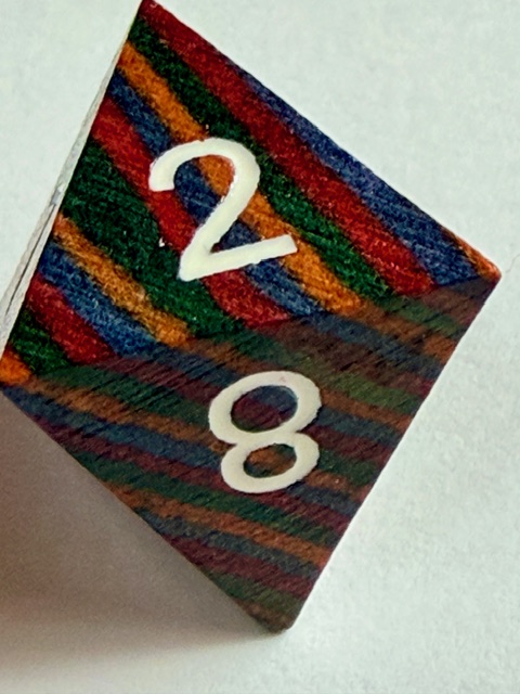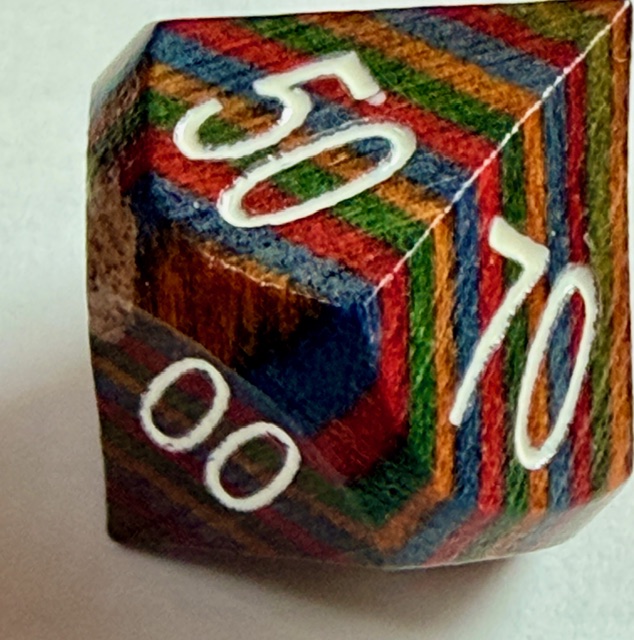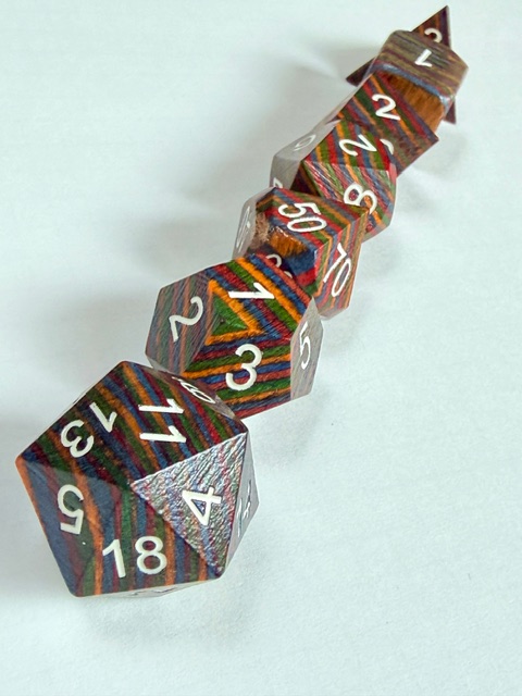 Description: This is a set of 7 sharp-edge wooden dice made from various colors of wood layered and pressed together. The numbers are inked in white. The font is Arial. The boring Temu/Alibaba Helvetica knock off that is Arial. At least it’s not Papyrus. The 6 and 9 faces use underbars to indicate their orientation. The d10s have beveled waists and the vertices on the d6 have been rounded off a little bit.