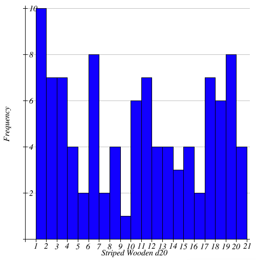 ** I’ve added a new value to the reviews called “Chi-square” which is a calculation of the difference between of the number of times each value was rolled in the d20 roll test compared to the number of times each value would be rolled in a perfectly equal roll test. (perfectly equal means every value comes up the same number of times, or [total number of rolls / number of sides on the die]) Chi-square gives a sense of how far away from the statistical average the results of the d20 roll test were. It’s not a perfect measure of a die’s balance and fairness but it’s a good step in that direction. More information about die fairness / balance roll testing can be found here: https://rpg.stackexchange.com/questions/70802/how-can-i-test-whether-a-die-is-fair