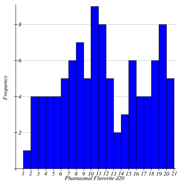 ** Chi-square is a calculation used to test whether your data is as expected. The basic idea behind the test is to compare the observed values (the results of my 100 roll test) to the expected values. (what you would see if a d20 landed on each number with the exact same frequency) and compare the two results to determine whether a die is balanced in this case.