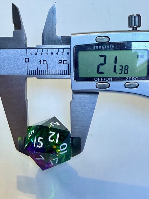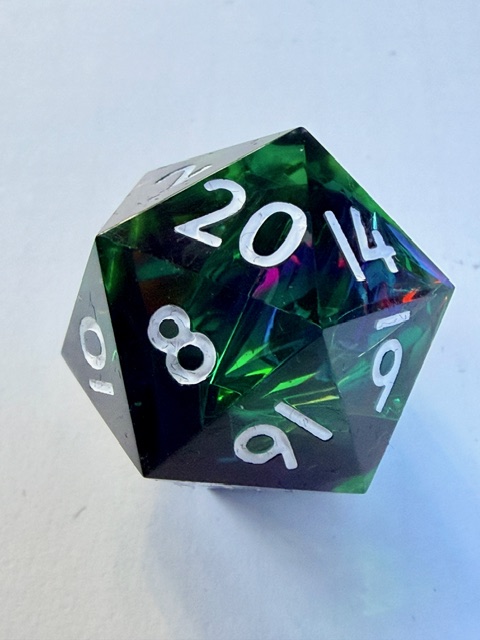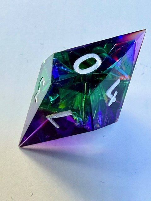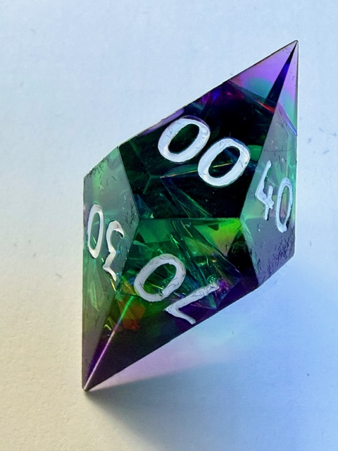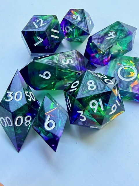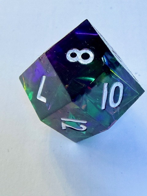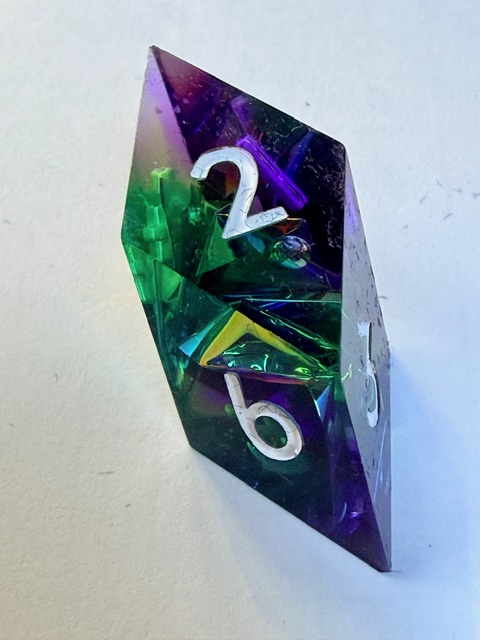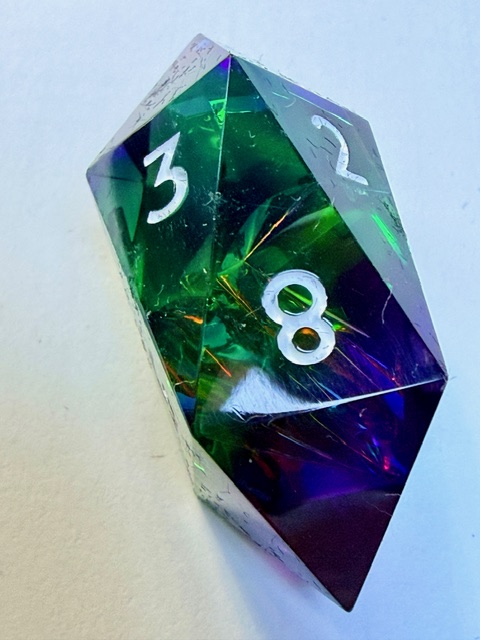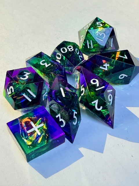 Getting back on topic, these dice are very pretty especially in good light where the holofoil has the opportunity to steal the show and catch your eye. I believe that this is the 3rd set of dice from Everything Dice made in this arrangement of shapes which I really like. That big chonky d8 and the rhombic d12 are just wonderful bits of geometry to bring to the table. I have one of the other two sets (Prismatic glass set) and the 3rd is a Critical Role collaboration set themed for Residuum (from the Vox Machina campaign) which aren’t my style as much as the two sets that I bought are. If I saw the Residuum set on sale for < $50 in the Critical Role online store I’d snatch them up in a second though.