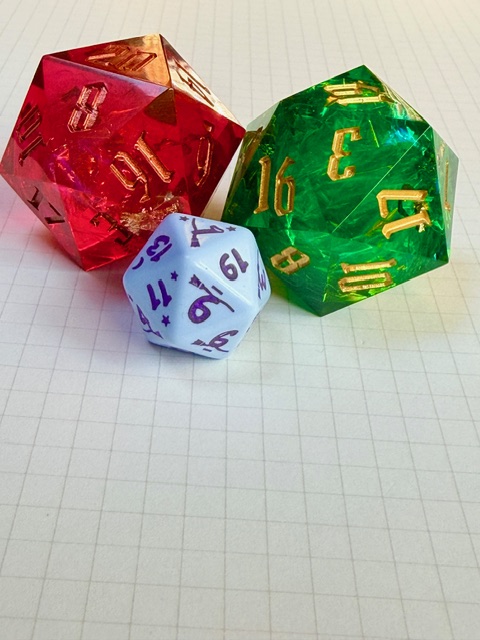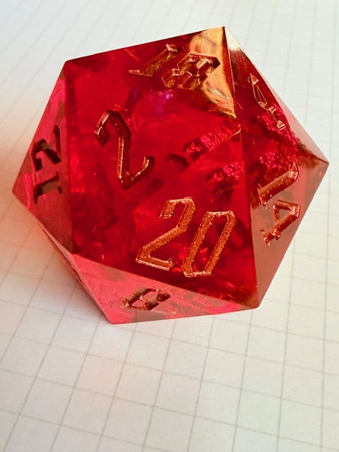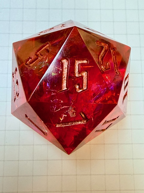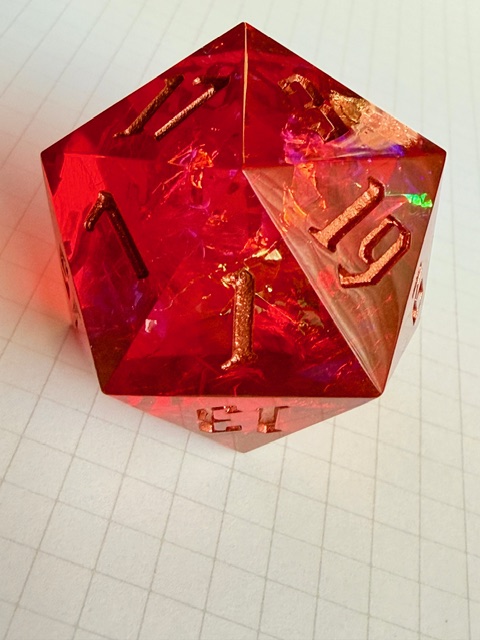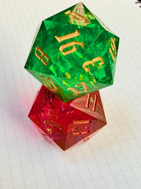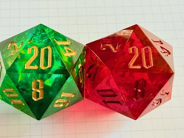 Overall they’re both very nice dice with a stylish font that I’m warming up to. One of them isn’t gorgeous but the other is. They’re both very well made and have clean lines / edges and no physical flaws/dings/scratches/mold marks that I’ve found. I know that seems like a low bar but some companies still struggle to meet that standard (Post #098 “The Perfect Kiss”). I’ll keep buying nice chonks like this and still call it a win. For just ten bucks you could be rolling a gorgeous shiny jewel that winks back at you.