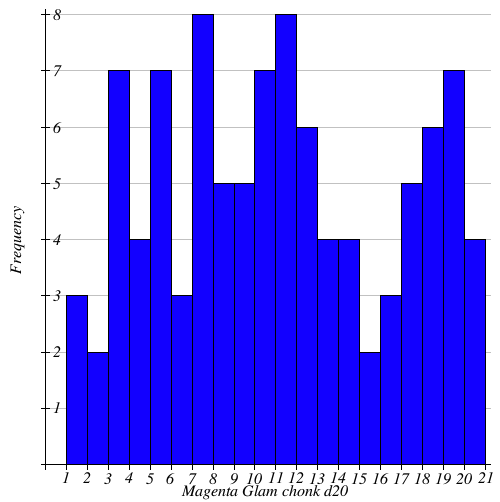 One Hundred d20 rolls (Magenta Glam): 9, 15, 18, 7, 14, 3, 1, 13, 7, 10, 7, 5, 11, 11, 9, 3, 16, 20, 10, 18, 11, 19, 5, 19, 14, 7, 19, 5, 10, 7, 11, 3, 5, 3, 12, 8, 11, 19, 1, 9, 13, 10, 13, 6, 10, 2, 8, 11, 4, 13, 20, 20, 17, 19, 7, 11, 18, 16, 16, 5, 9, 6, 12, 4, 5, 10, 18, 10, 9, 3, 2, 17, 14, 12, 18, 17, 8, 6, 14, 15, 3, 8, 4, 1, 3, 12, 4, 18, 11, 7, 8, 12, 12, 19, 5, 20, 19, 7, 17, 17
