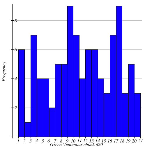 One Hundred d20 rolls (Green Venomous): 11, 17, 14, 17, 16, 4, 6, 10, 9, 13, 8, 8, 11, 10, 7, 1, 16, 16, 14, 1, 3, 9, 13, 16, 9, 1, 17, 4, 5, 17, 15, 10, 16, 1, 19, 7, 8, 14, 17, 6, 18, 10, 9, 2, 10, 14, 12, 4, 15, 3, 12, 11, 10, 3, 12, 19, 17, 8, 7, 16, 9, 13, 11, 8, 13, 3, 3, 17, 20, 17, 4, 1, 13, 5, 20, 19, 15, 3, 5, 9, 17, 7, 12, 13, 1, 3, 16, 18, 18, 9, 12, 5, 9, 9, 19, 12, 19, 7, 10, 20