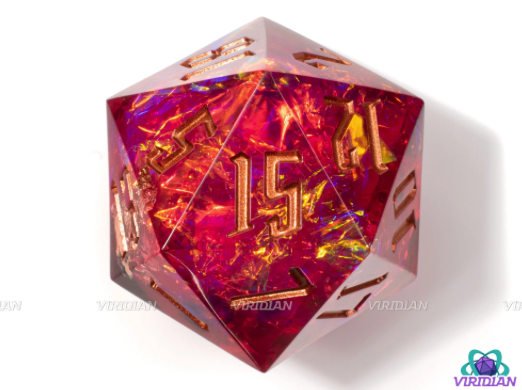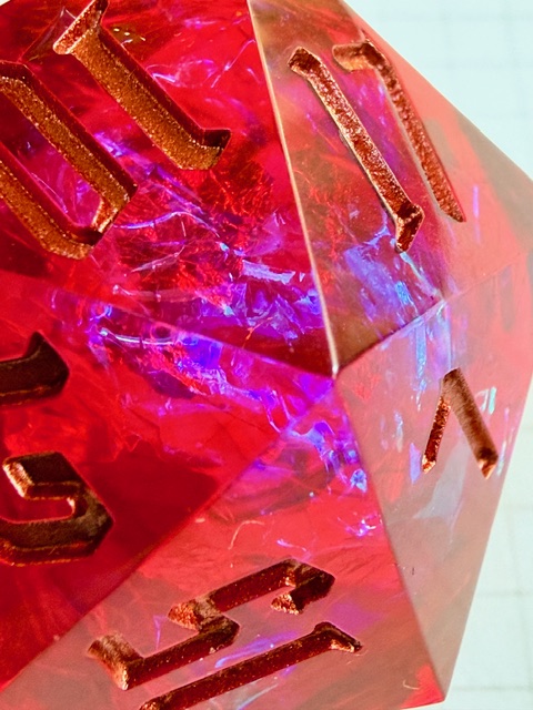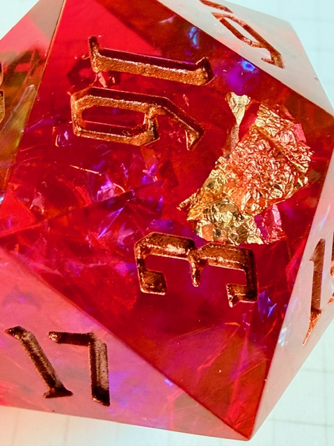 Magenta Glam: A sharp-edge chonk d20 with medium translucent resin with some (but not much) gold holofoil inside. The font is inked in a rose gold color. The font is the standard Viridian Gaming font that I can’t find the name of. It’s close to Texturina and Cloister Black in that both are Gothic fonts with a couple of similar elements. The 6 and 9 faces use underbars to indicate their orientation.