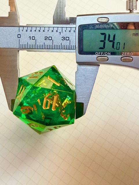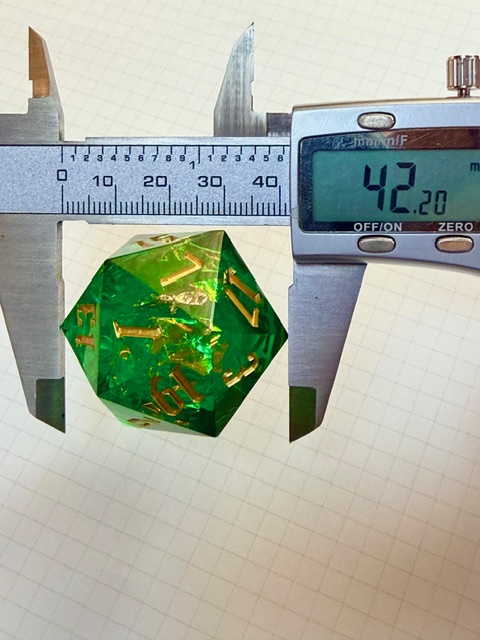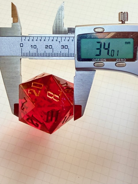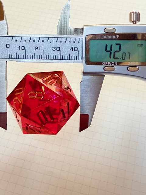 I’m impressed that both dice are nearly identical in size and both are 1mm larger than advertised. So often dice are marketed with inflated size numbers. I don’t know if that’s just companies being lazy and giving high estimates or if it’s their way of selling you less for more.