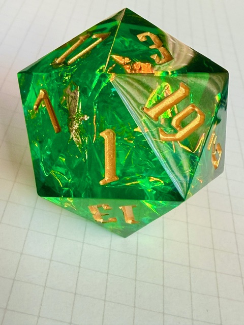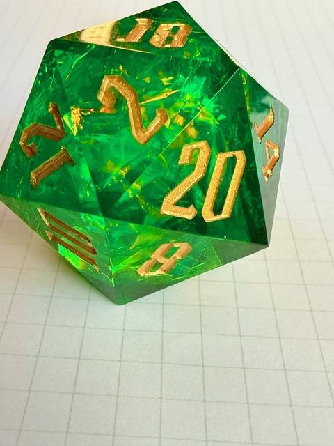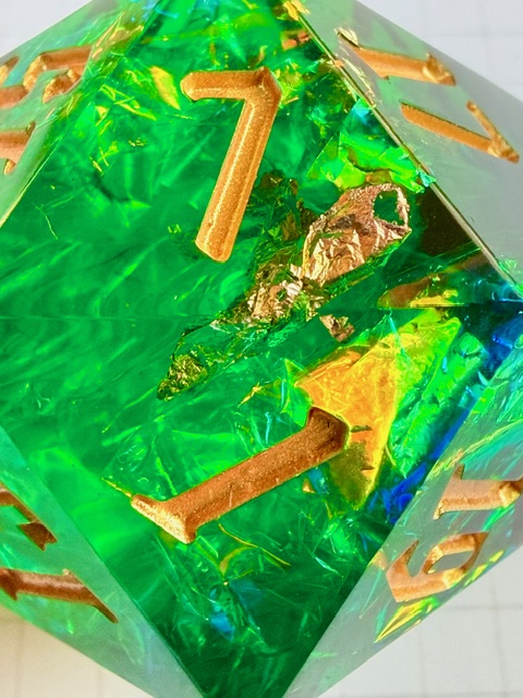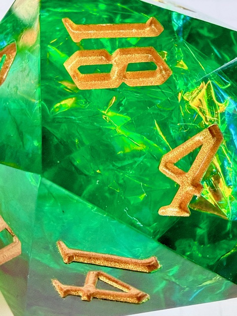 Venomous: A sharp-edge chonk d20 with translucent green resin and plenty of yellow/gold holofoil inside. It has the same font as the Magenta Glam d20 described above. The numbers are inked in gold which works surprisingly well with the green resin. The 6 and 9 faces use underbars to indicate their orientation.